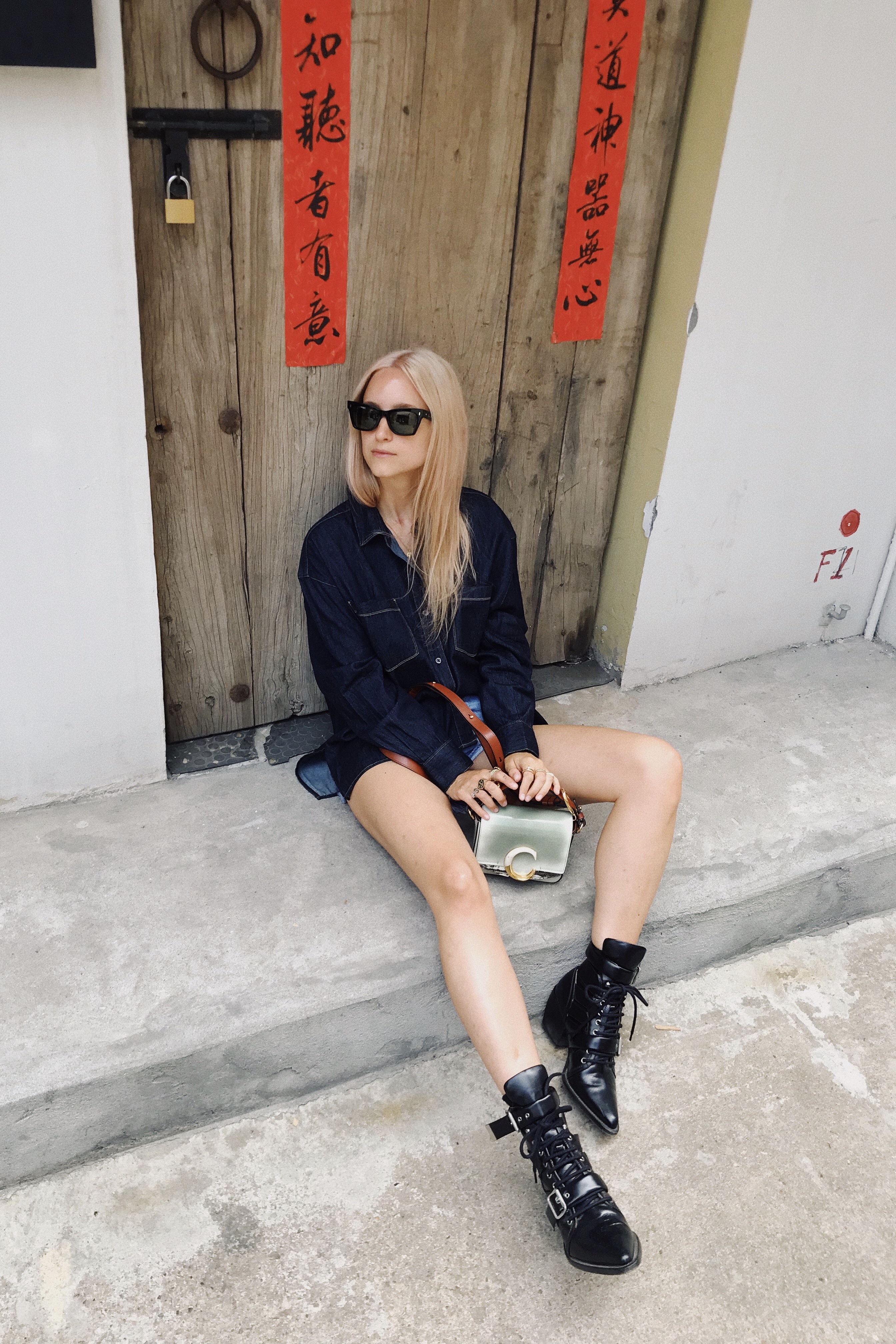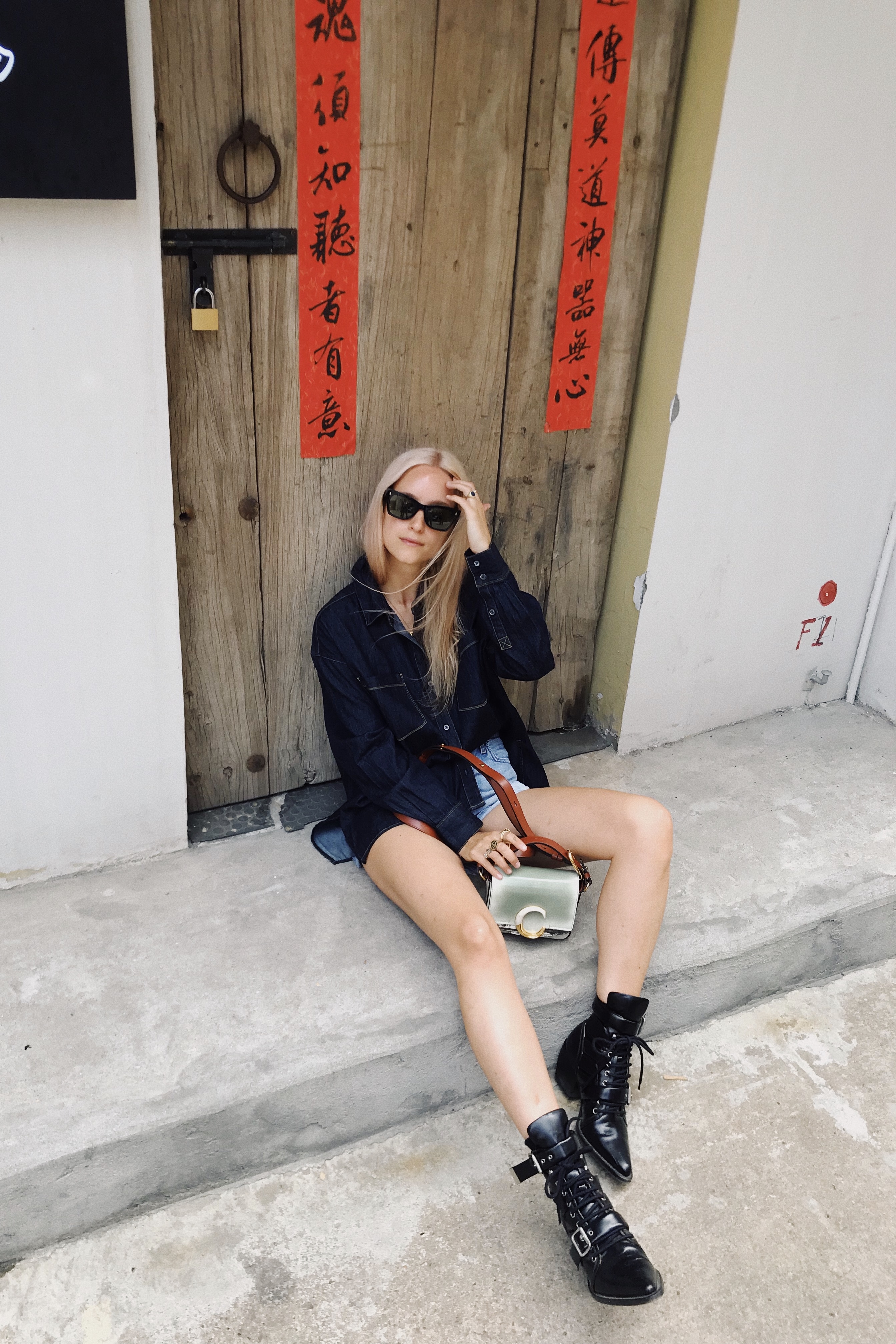 There’s never been a day in my life where I decided against a double denim look. I loved finding out this was called the “Canadian Tux” even though I havent’ really dug deeper into where that came from… The reason why I always love it, is because it’s sophisticated yet easy to wear. The focus of your look are more on the accessories and shoes you wear it with. In this photo I wore my double denim look on a recent press-trip to Shanghai with Chloe, hence the Chloe boots and Chloe bag. The sunglasses I’m wearing are Celine, the denim shirt by 3×1 and the shorts RE/DONE jeans (both on SALE).