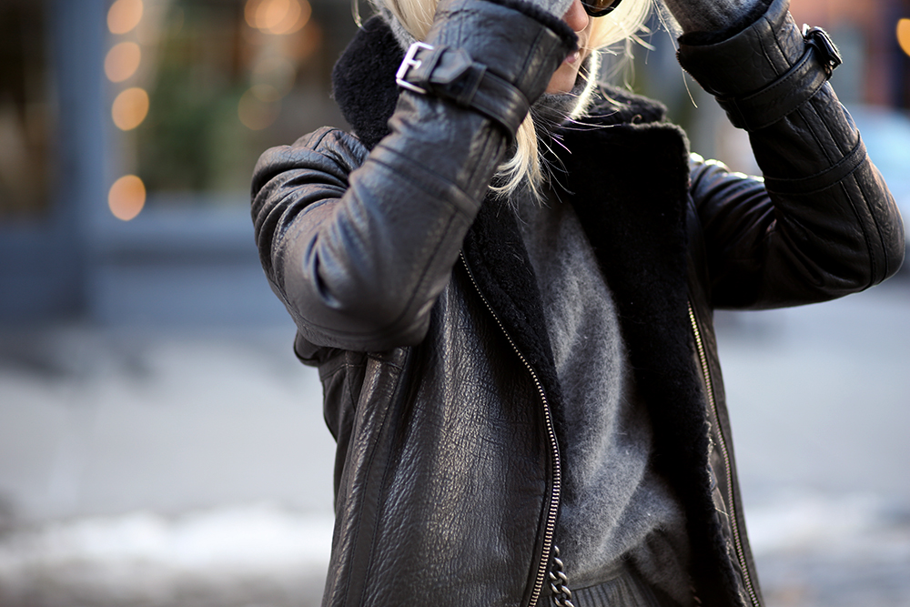 Whistles shearling biker jacket // Blake LDN knit // Zara skirt // Zara boots // Chanel Boy bag // Wolford tights // Celine sunglasses.