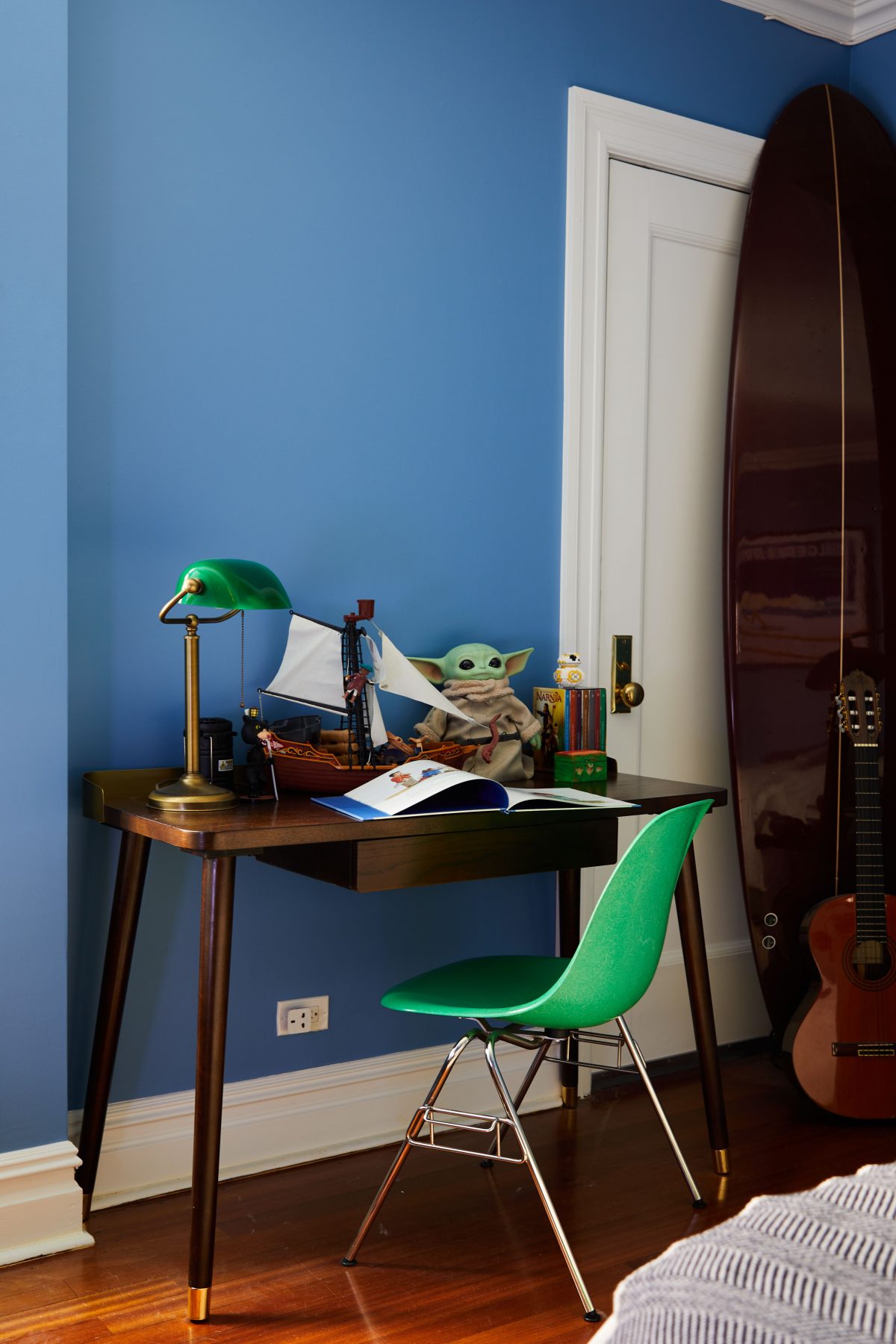 Accessories around the bed we kept simple, but in line with the color palette of the room and the style we were vibe we were trying to achieve. For James this meant a more grownup atmosphere in Kelly green and Cook’s blue – by Farrow & Ball – and darker wooden undertones, for Stella bright and happy mixing boldly tones of red and pink, and a beautiful wallpaper by Work + Sea.